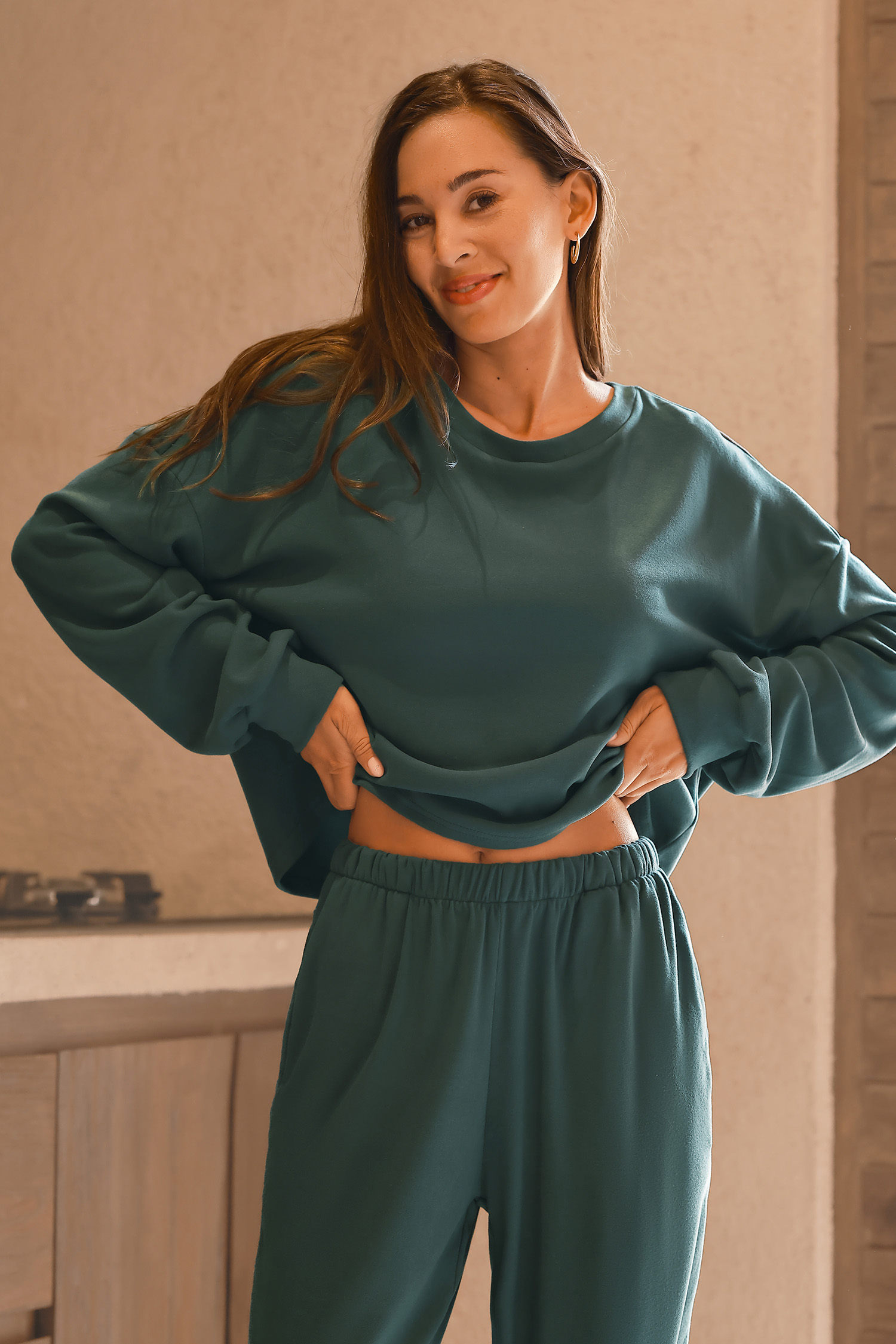 Conjunto de pijama con cuello redondo y pantalones en color verde bosque