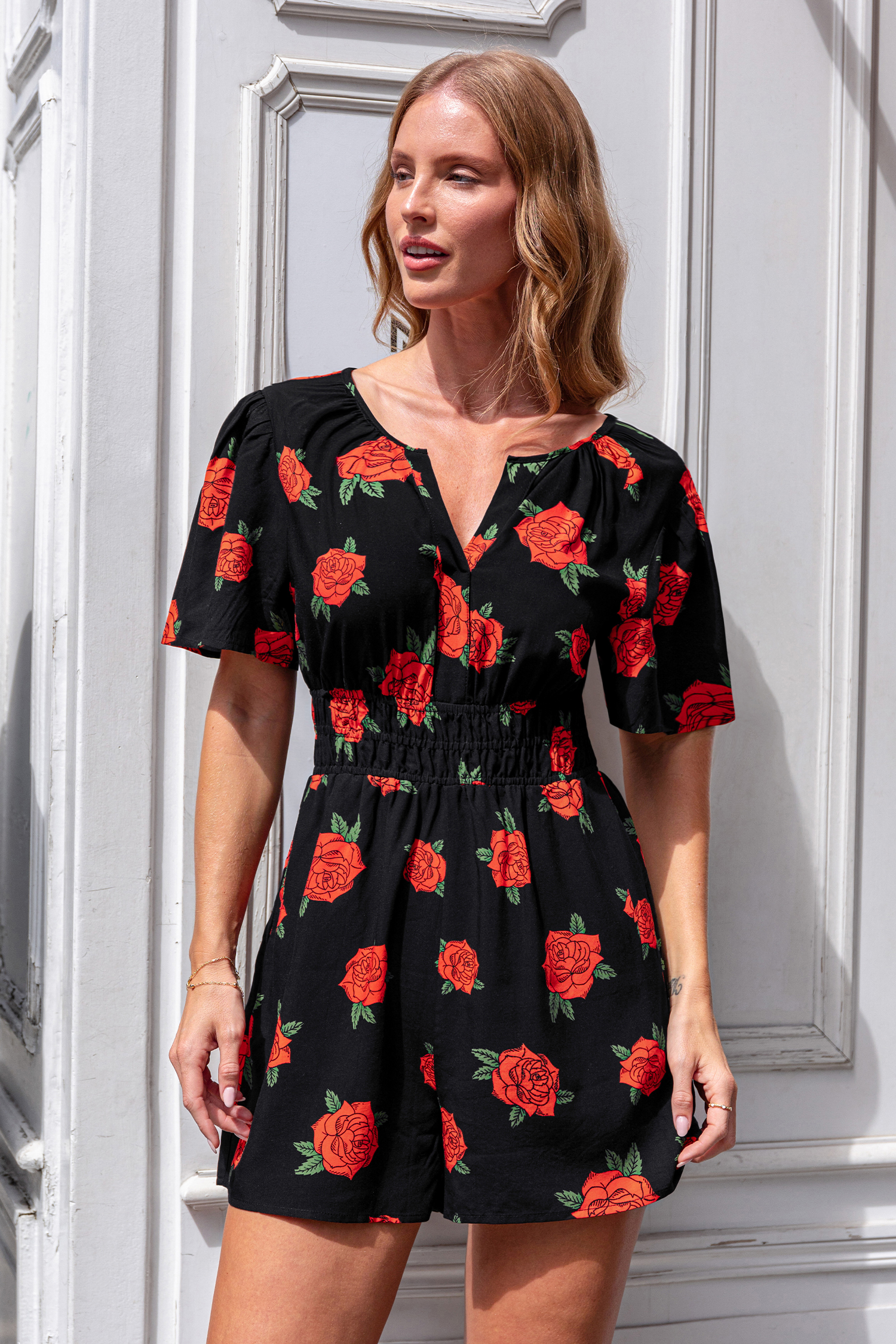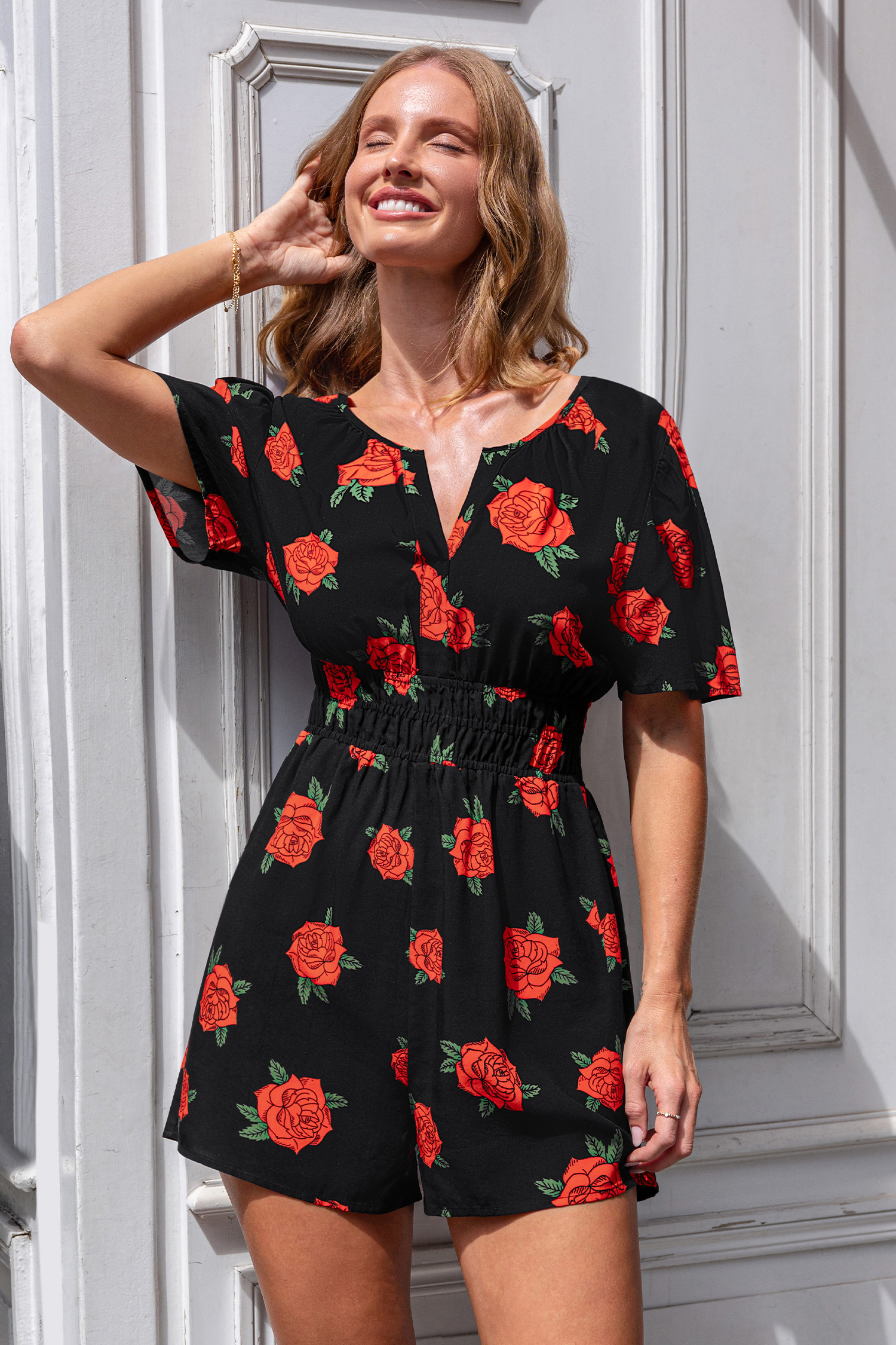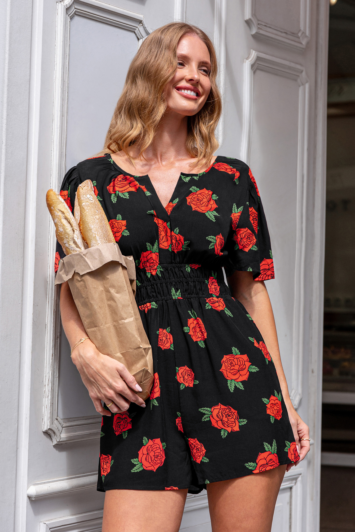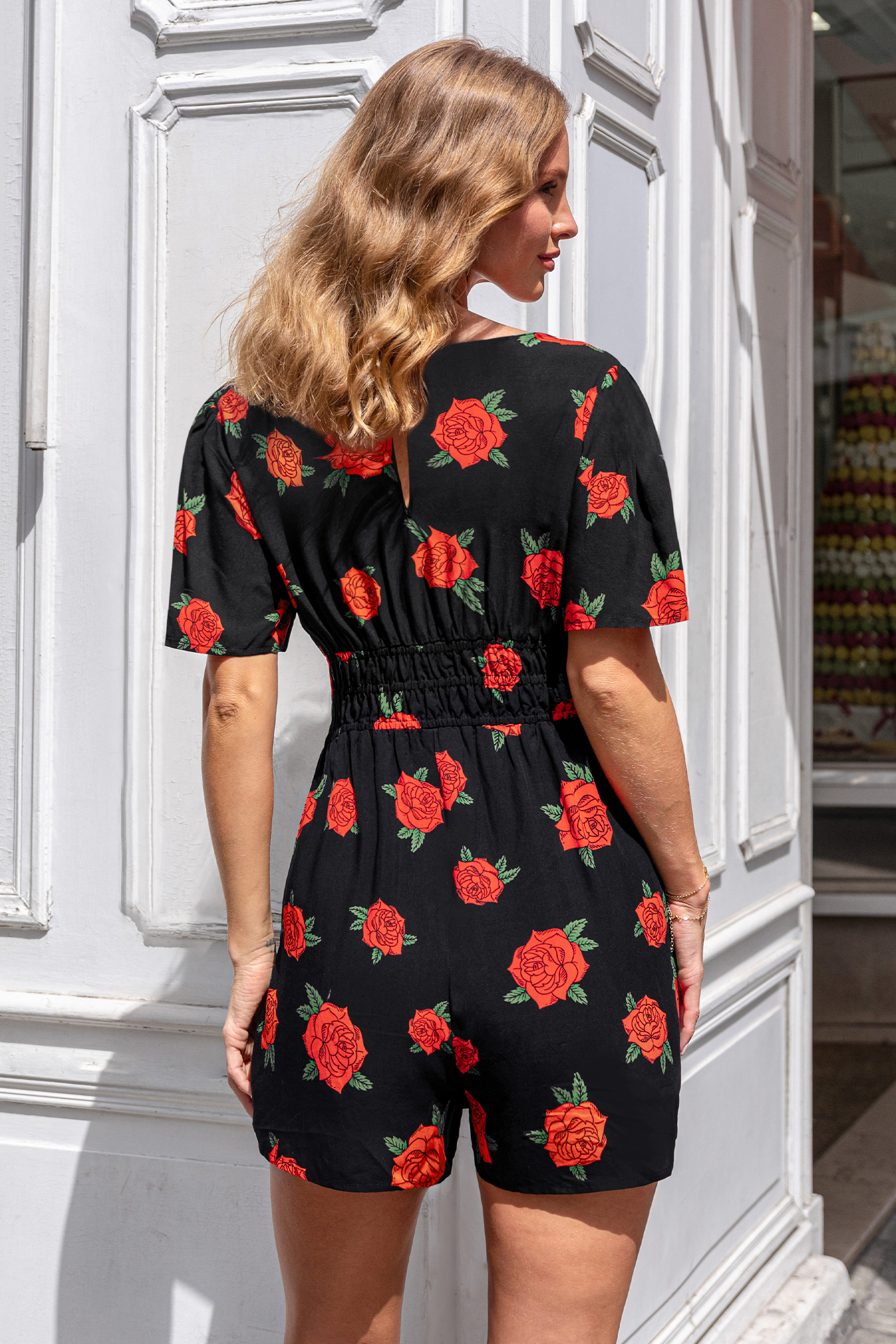 El mono floral Rose Bloom es tu prenda ideal para un estilo femenino y sencillo. Con escote con muescas, mangas cortas, cintura elástica y piernas sueltas, te ofrece un ajuste fresco y cómodo que se adapta a tus movimientos.